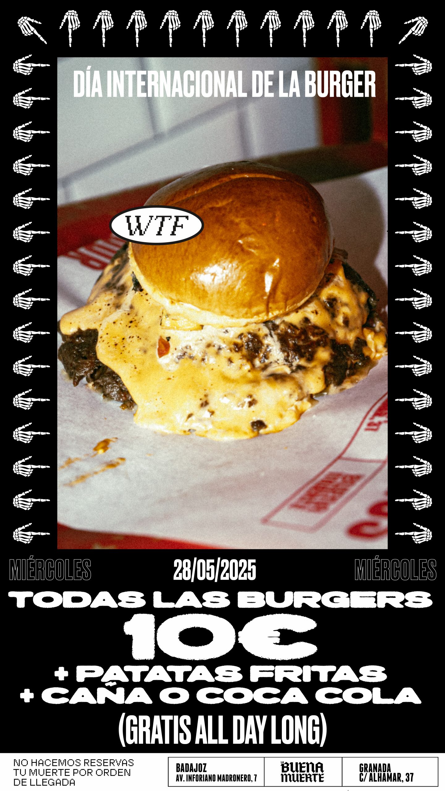 Cada 28 de mayo se celebra el Día Internacional de la Hamburguesa, una fecha dedicada a rendir homenaje a uno de los grandes clásicos de la cocina callejera. Más que una comida, la burger se ha convertido en un símbolo cultural que une a amantes del buen comer. En La Buena Muerte, Granada y Badajoz, no podíamos quedarnos al margen y hemos preparado algo especial para celebrarlo como se merece.